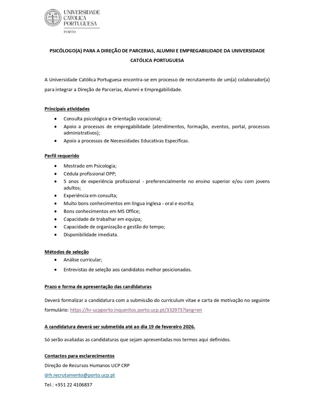 Direção de Recursos Humanos UCP CRP: drh.recrutamentoOporto.ucp.pt Tel.:+351 22 4106837